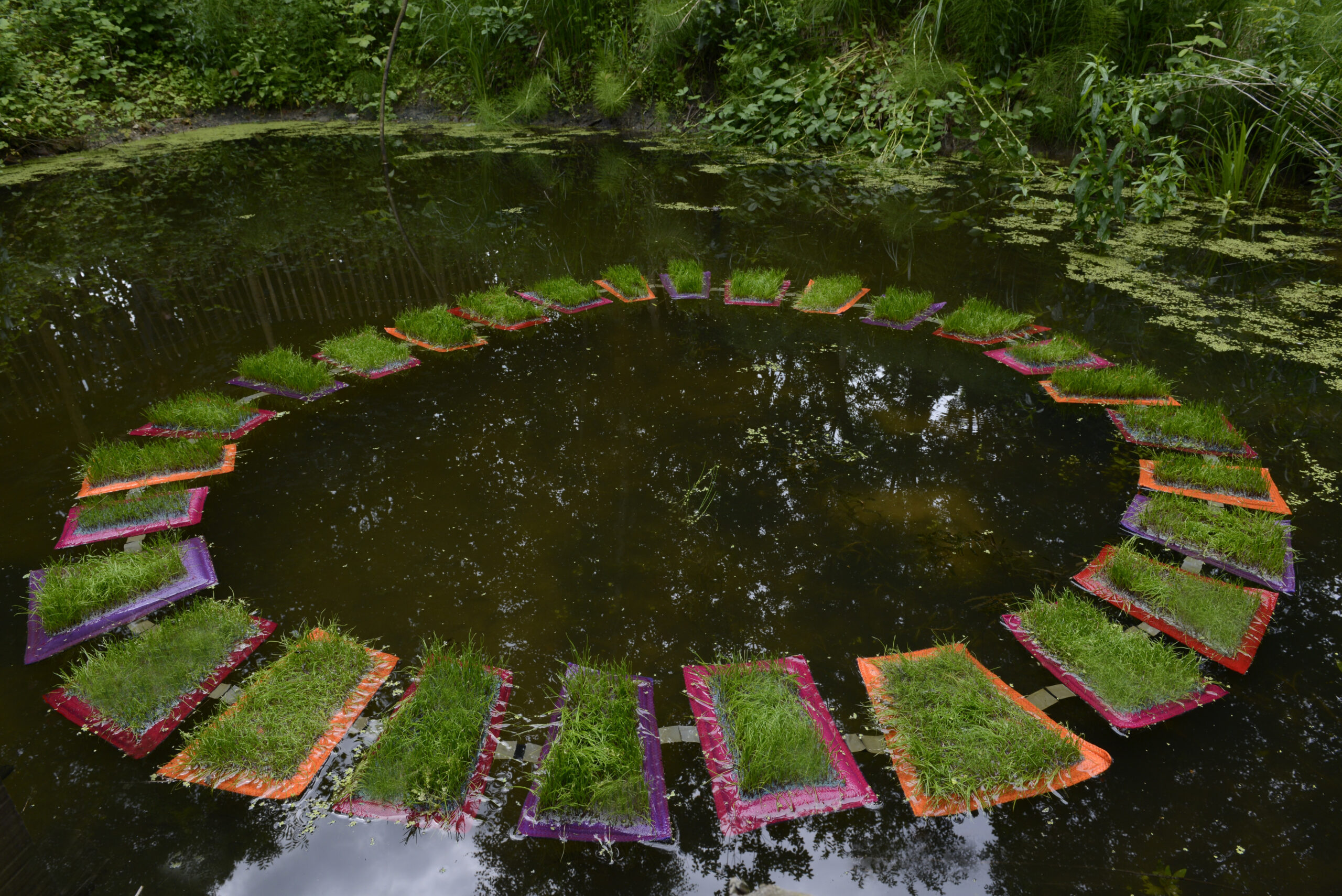 Installation de 28 trapèzes textiles de 0,40 m x 0,20 m reliés entre-eux par le plus petit côté formant un cercle flottant sur l’eau.