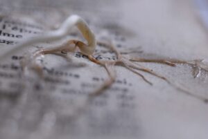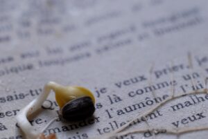 Des graines de lin, de tournesol, de millet et de gazon sont disposés dans des livres et des textiles qui sont ensuite trempés dans l’eau… deux semaines plus tard, la magie opère.